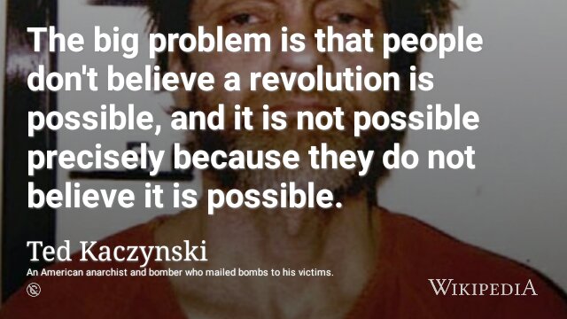 “The big problem is that people don’t believe a revolution is possible, and it is not possible precisely because they do not believe it is possible.” (Ted Kaczynski)